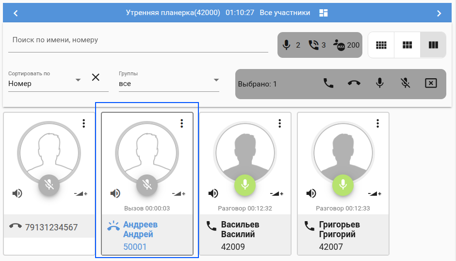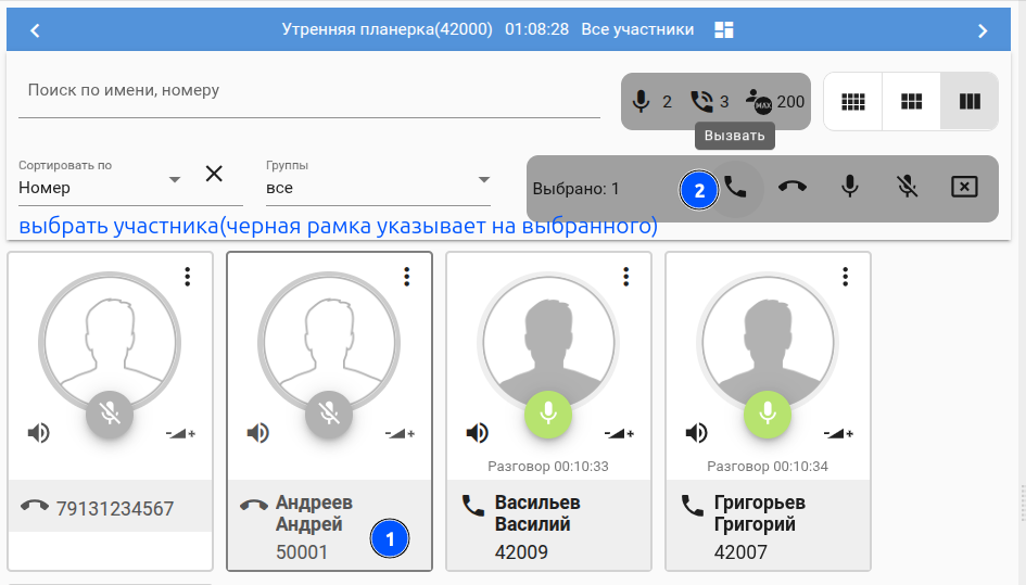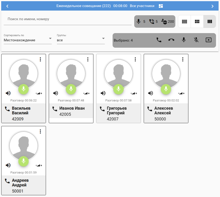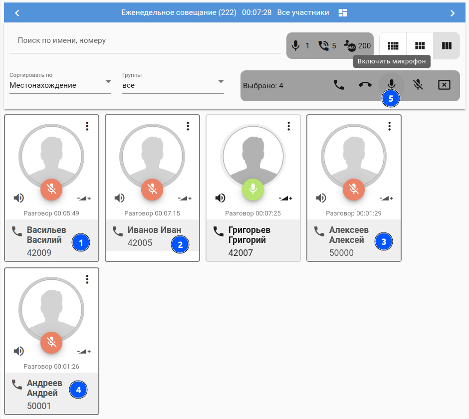 | Выбрать группу участников (в примере № 42009,42005,50000,50001), а затем нажать клавишу "Включить микрофон". |