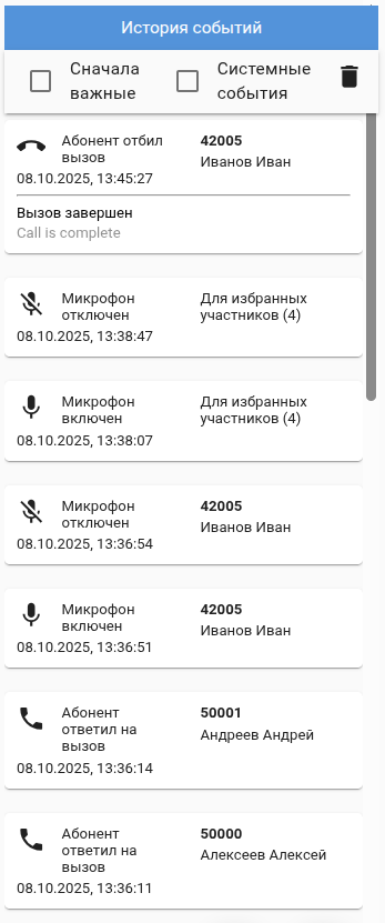 Для удобства ведущего совещания система ведет журнал "История событий" где сохраняются все действия по изменению совещания, а именно время события, действие, объект (участник). В любой момент можно просмотреть все действия в "Истории событий" если совещание активно, или в журнале если совещание уже закончено.