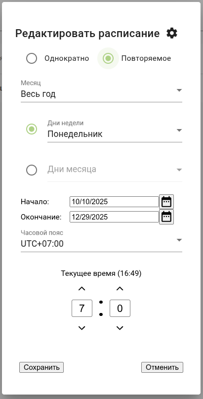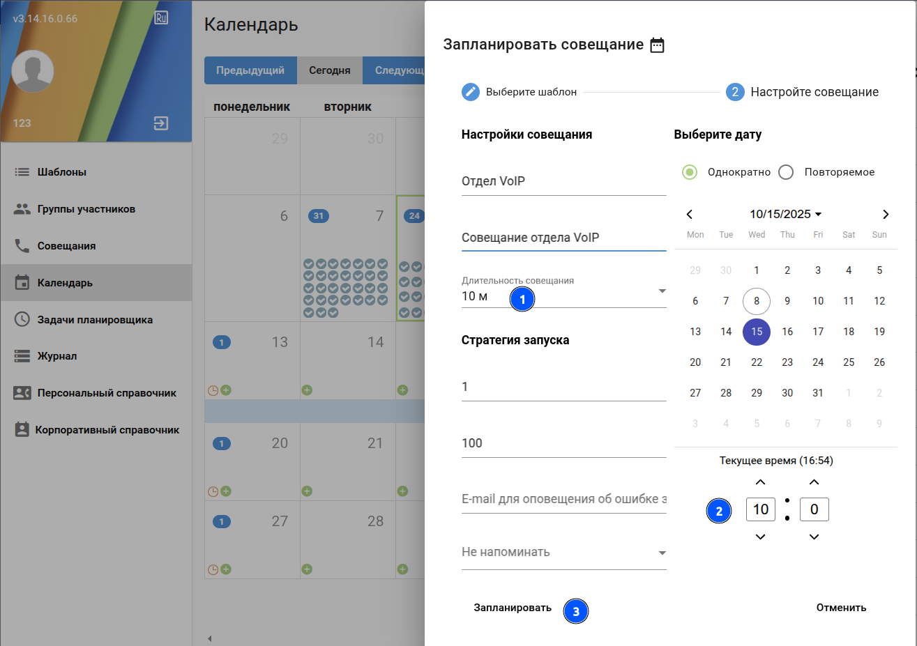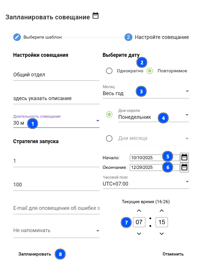 Указать параметры и даты запланированного совещания (продолжительность, однократное/повторяемое, дни недели, дата начала/окончания, время):