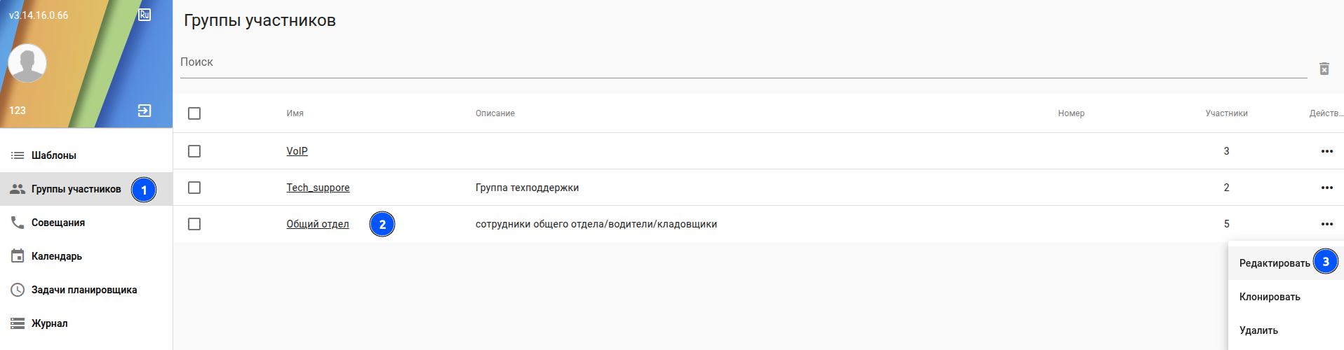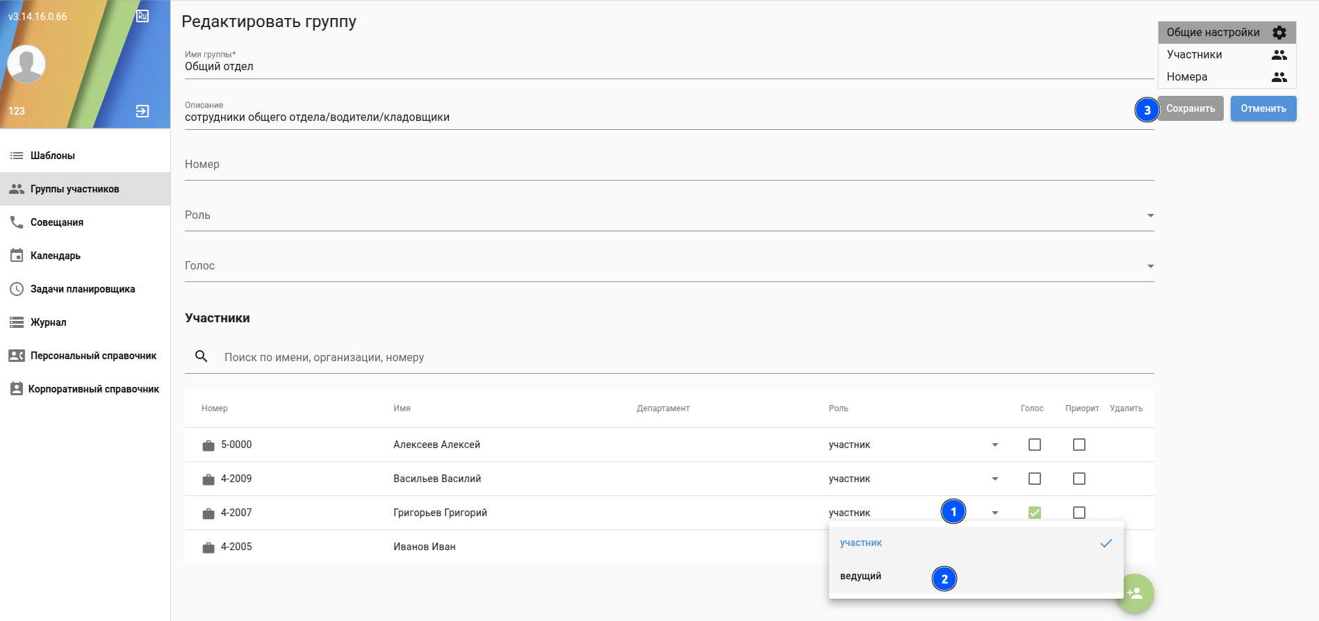 - Группы участников - создание и редактирования групп участников селекторного совещания;