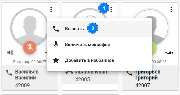 | Выбрать участника (кликнуть на его карточку), а затем нажать клавишу "Вызвать". |