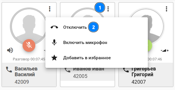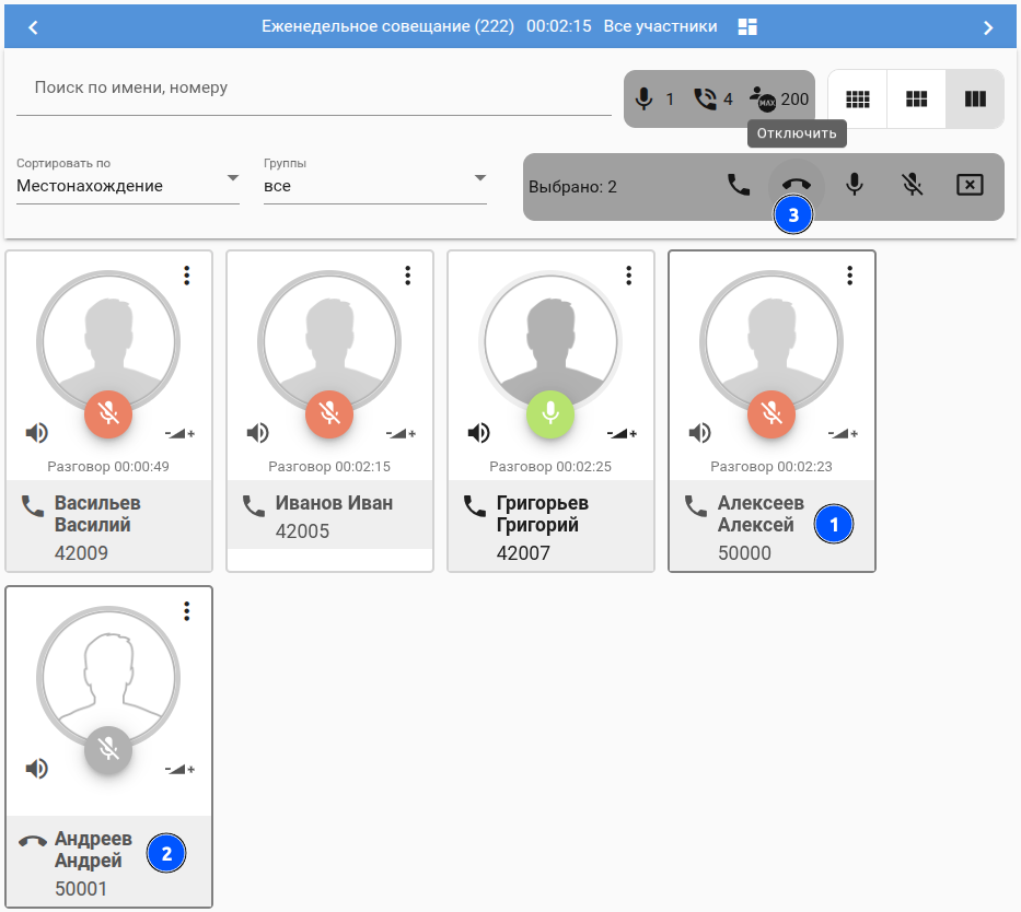| Выбрать несколько участников (карточки в черной рамке), а затем нажать клавишу "Отключить". |