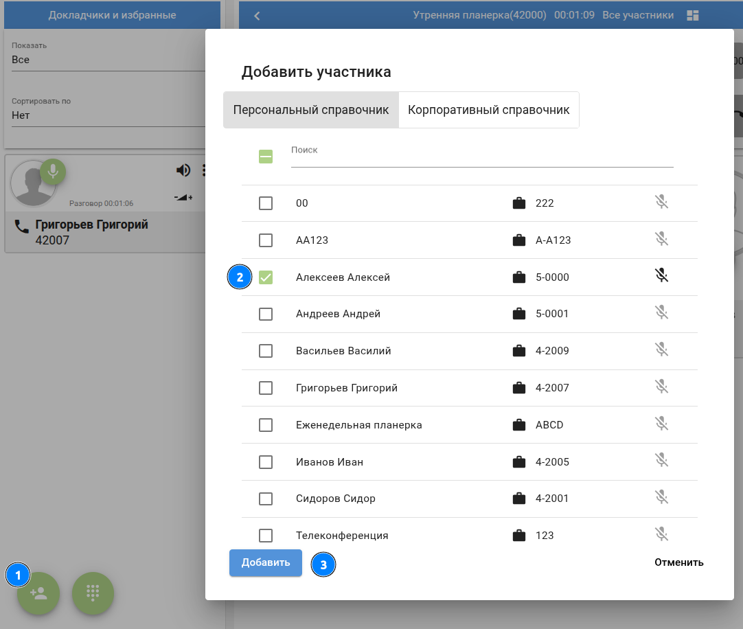 В первом случае выбираем участников из "Корпоративного справочника" по имени /номеру , так же сразу можно указать вкл/выкл микрофон для данного участника: