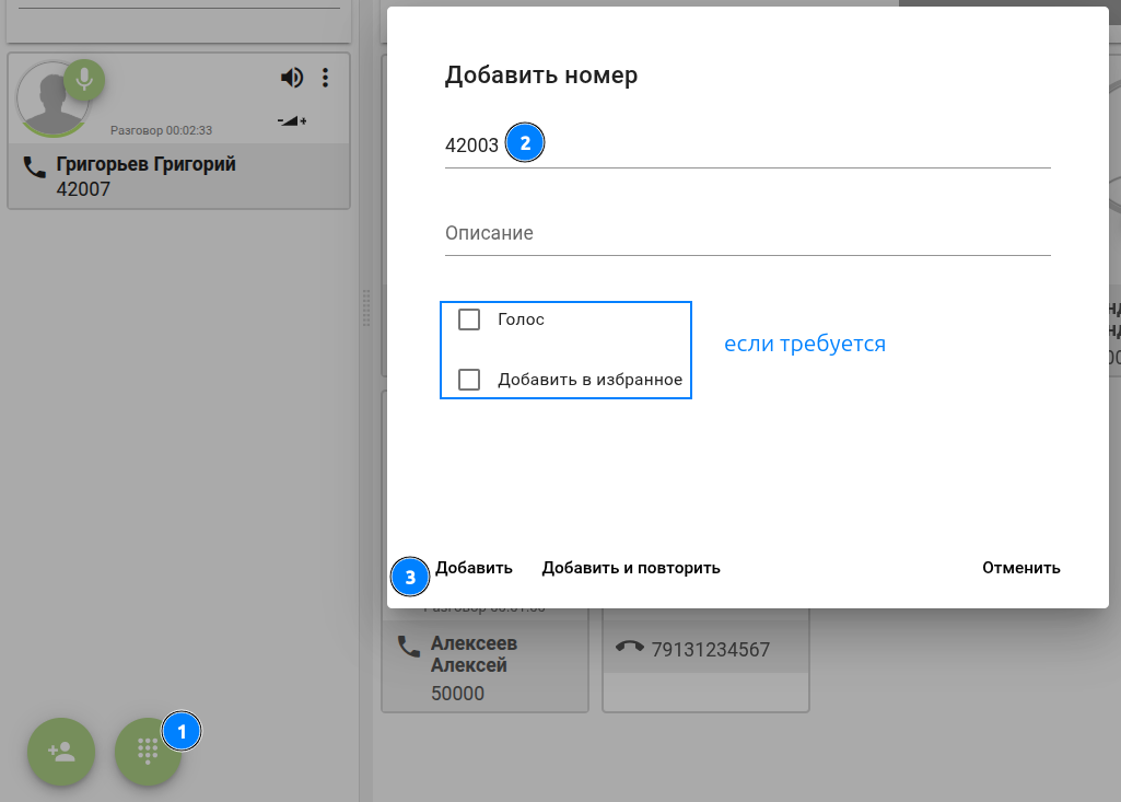 соответственно (при добавлении можно активизировать микрофон абонента/добавить в группу "избранные" если это требуется):