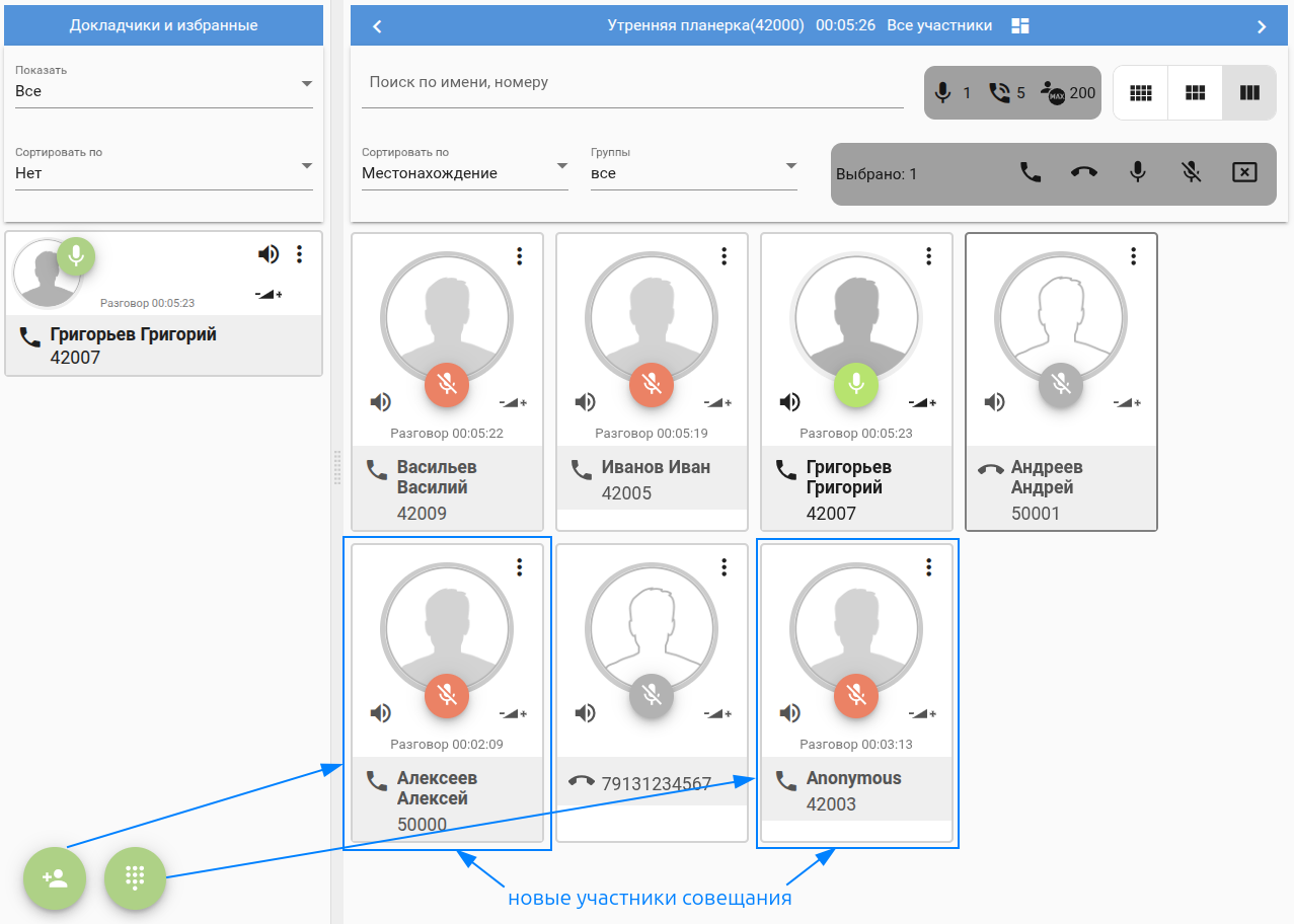 Участники будут подключаться к совещанию путем набора номера совещания (в примере 42000). В результате получим такую информацию в web - все участники "Ananymous":