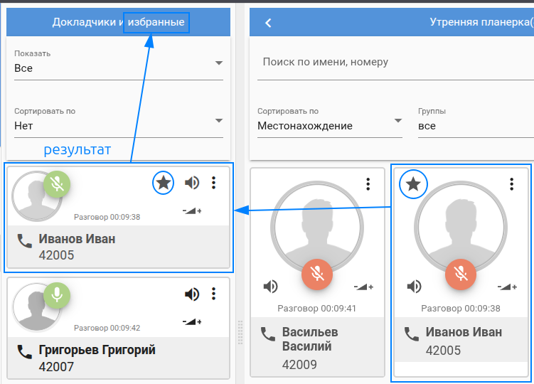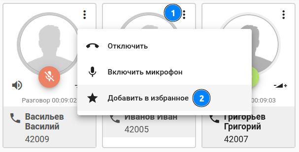 Для удобства управления (для примера периодически вкл/выкл микрофон) определенными абонентами/участниками - их можно добавить в группу "избранные":