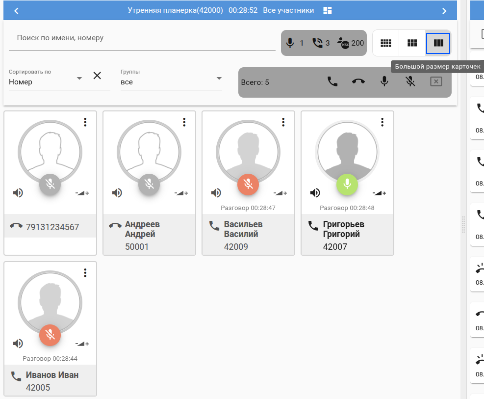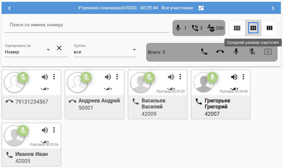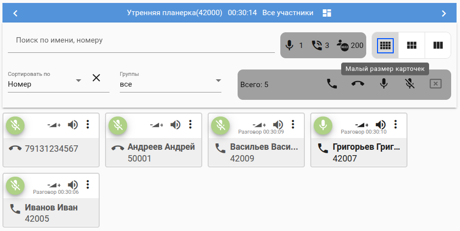В случае большого количества участников есть возможность менять размер карточек участников/ выполнить фильтрацию: