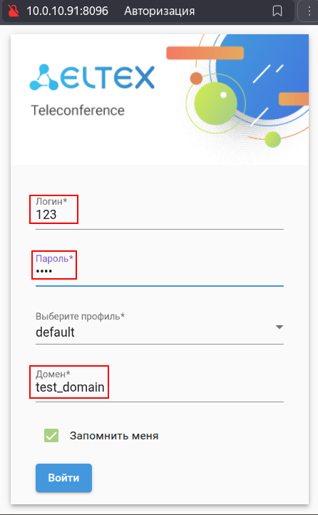 Управление селекторным совещанием реализовано через web интерфейс. Для подключения к АРМ (Автоматизированное Рабочее Место) менеджера селекторного совещания необходимо перейти в браузере по ссылке: http://<TC_ADDR>:8096, где <TC_ADDR> — IP-адрес (для примера 10.0.10.91:8096) или доменное имя хоста с установленной услугой ecss-teleconference-ui. Для входа требуется указать имя пользователя, пароль пользователя и домен (имя виртуальной АТС)
