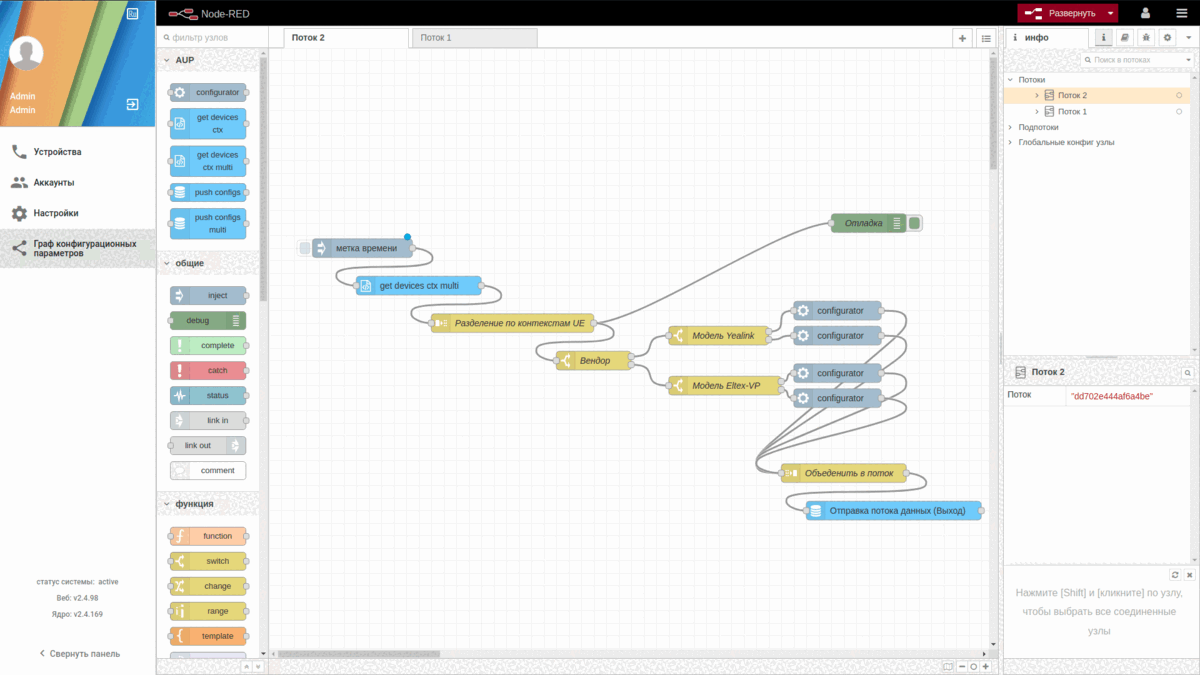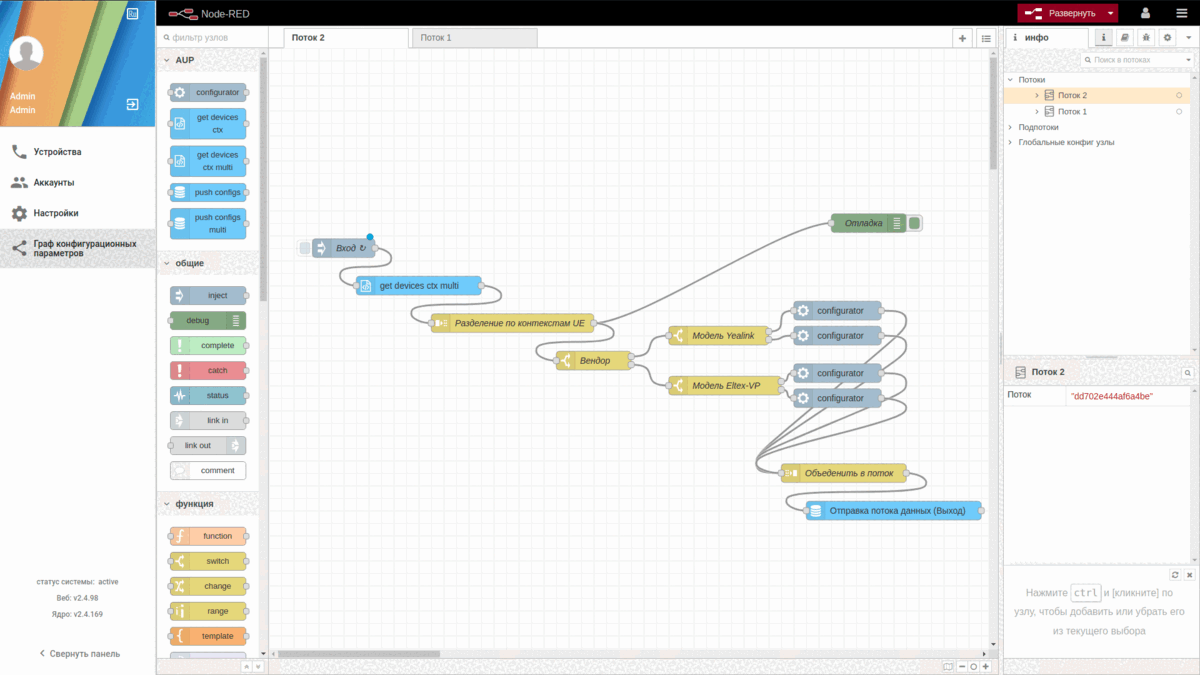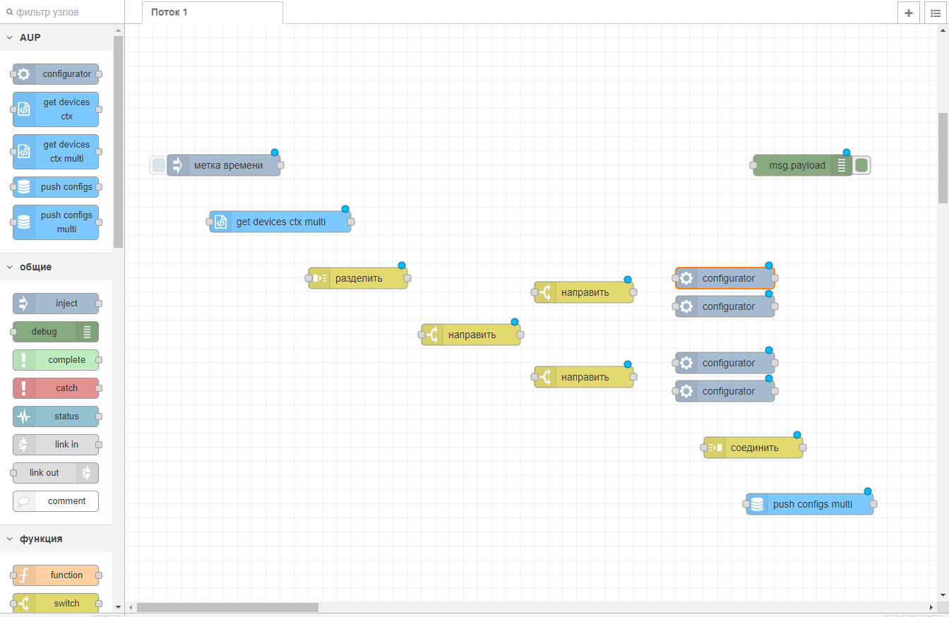 Для создания конфигурации необходимо перейти на вкладку сервиса «Граф конфигурационных параметров» (более подробно в разделе Сервис конфигурации параметров), создать новый поток и разместить на нем следующие компоненты (далее узлы) в таком порядке: