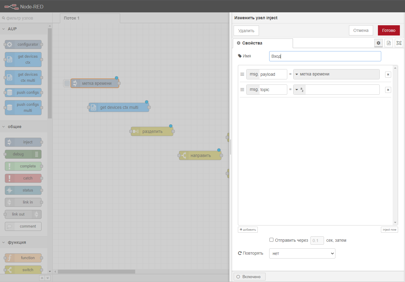 2. В настройках узла inject в поле «Имя» введите значение «Вход».