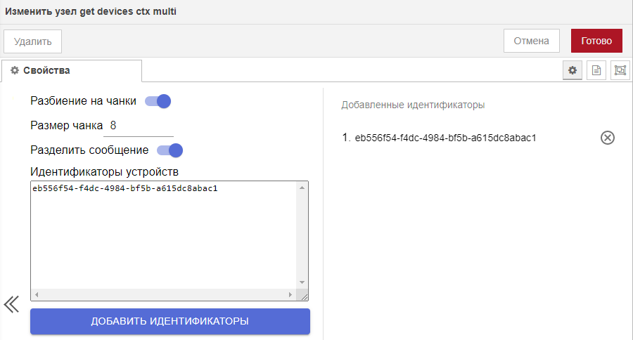 5. Откройте узел get device ctx multi, добавьте в его список скопированный идентификатор устройства и нажмите кнопку Добавить идентификаторы.