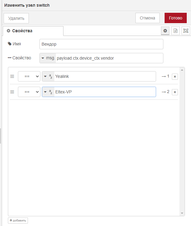 7. Вставьте скопированный путь в параметр «Свойство» (например, payload.ctx.device_ctx.vendor) узла switch. Также в данном окне можно настроить «Имя» узла, а затем на вкладке «Внешний вид» присвоить имена для выходных портов узла.