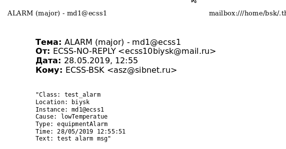 admin@mycelium1@ecss1:/$ domain/biysk.local/alarms/notifiers/email/send_test_email Send test alarm successfully [exec at: 28.05.2019 12:53:03, exec time: 33ms, nodes: md1@ecss1]