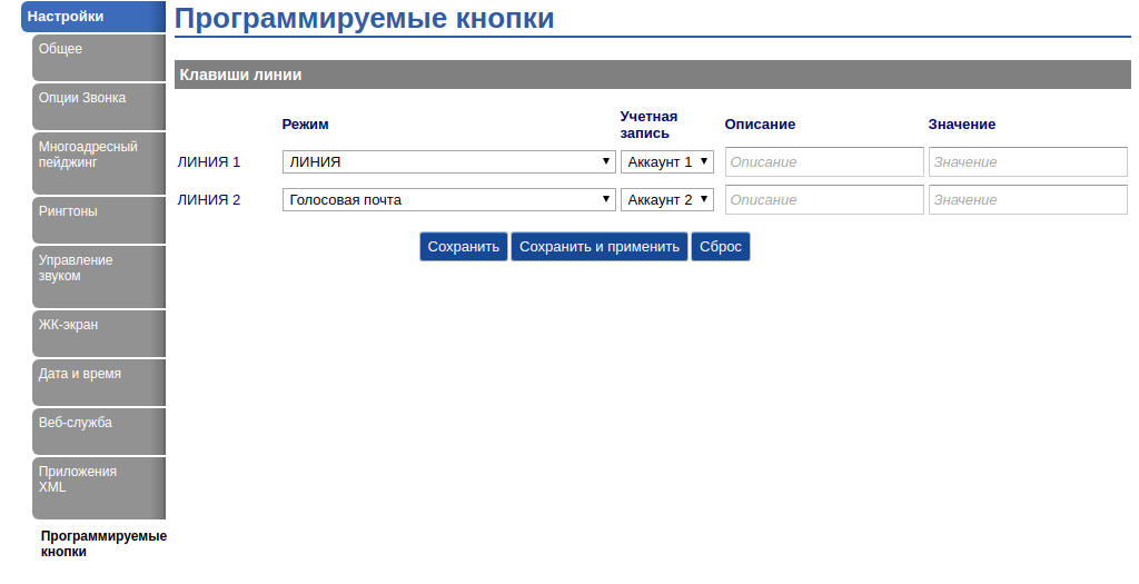 Из перечня программируемых клавиш выбираем свободную, назначаем ей режим "Голосовая почта" и указываем используемый аккаунт.