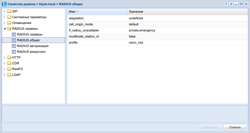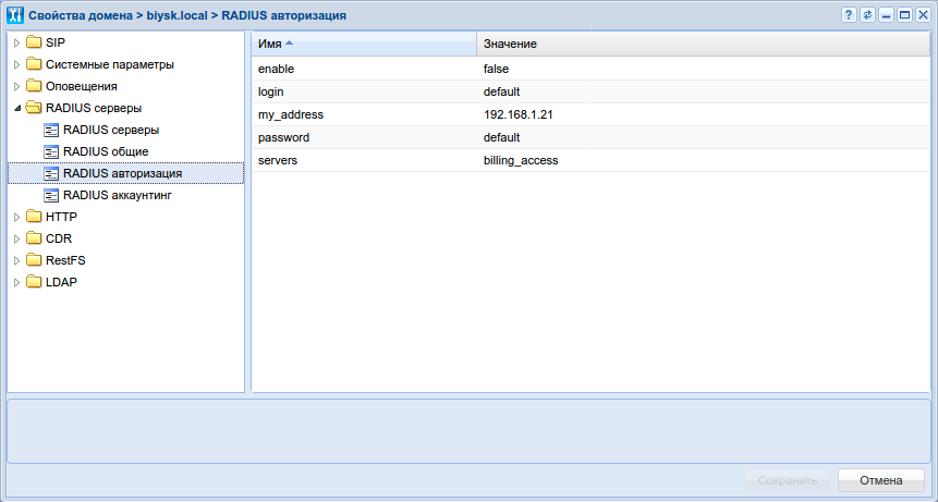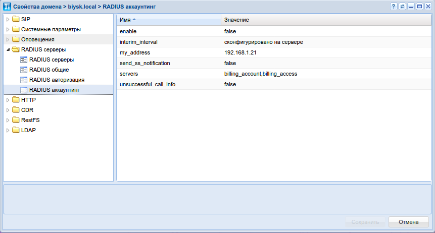 ┌──────────────────────┬───────────┬──────────────────┐ │ Property │ Domain │ Value │ ├──────────────────────┼───────────┼──────────────────┤ │enable │biysk.local│true │ │interim_interval │biysk.local│server_configured │ │my_address │biysk.local│192.168.1.21 │ │send_ss_notification │biysk.local│false │ │servers │biysk.local│1: billing_account│ │unsuccessful_call_info│biysk.local│false │ └──────────────────────┴───────────┴──────────────────┘где