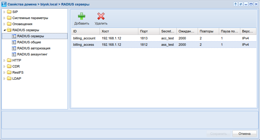 RAIDUS сервера создаются для каждой виртуальной АТС отдельно, и затем могут быть использованы в подсистеме аккаунтинга.