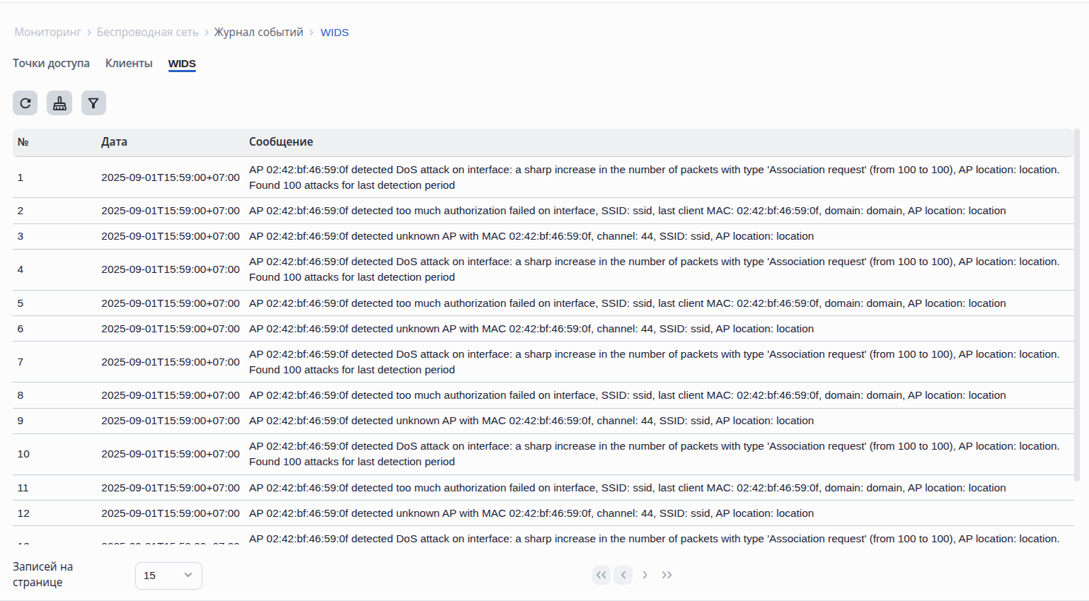 На странице представлен журнал событий для клиентов Wi-Fi с временными метками. Журнал содержит события, информирующие о подключении/отключении клиентов, ошибках регистрации, роуминге. В параметре «Общее количество» отображается общее количество записей в журнале. При появлении большого количества записей, на странице появляется параметр "Записей на странице" с возможными значениями: 15, 50, 100, 150 и 200, а также появляется возможность переключения между страницами.