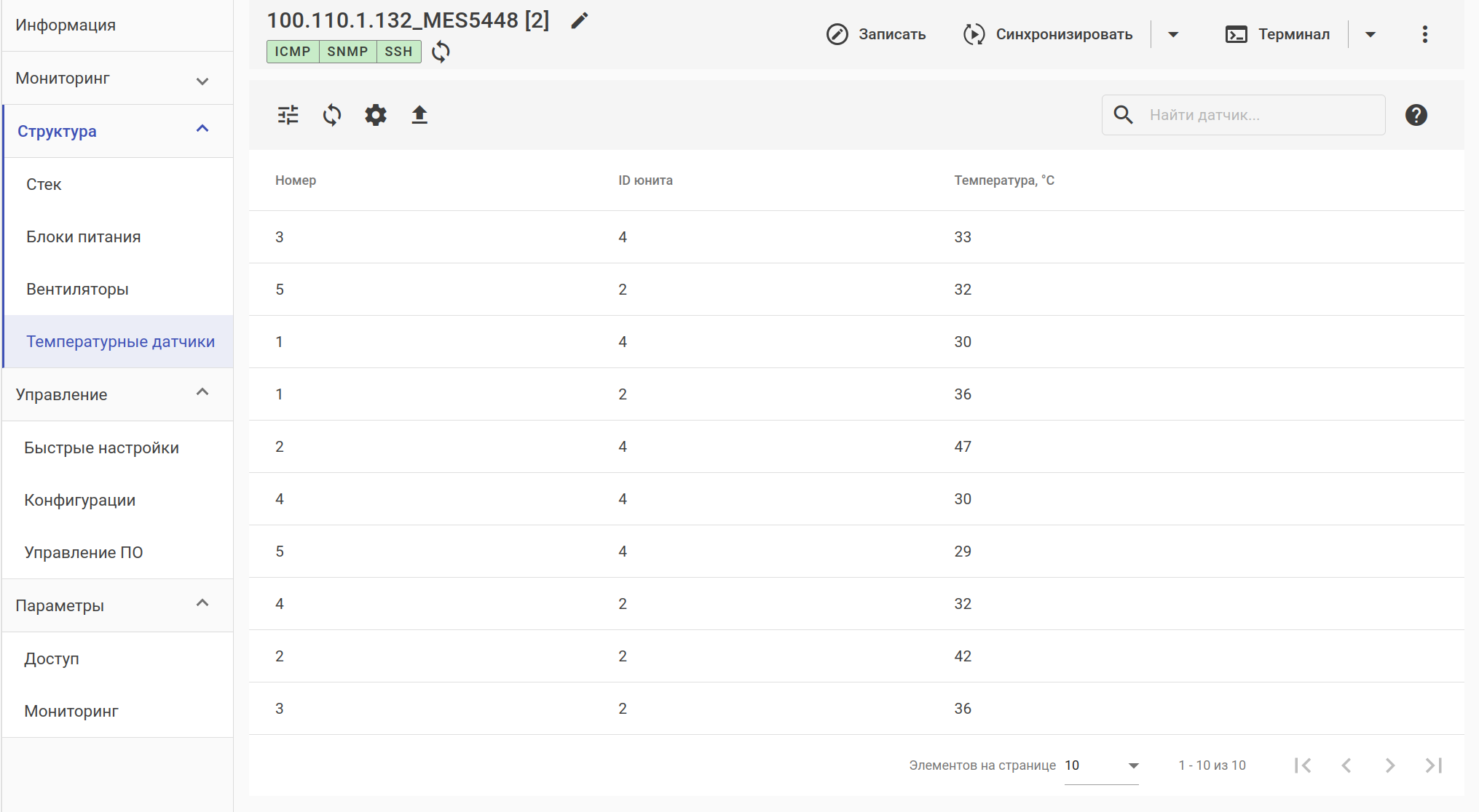 В разделе отображается информация о температурных датчиках устройства.