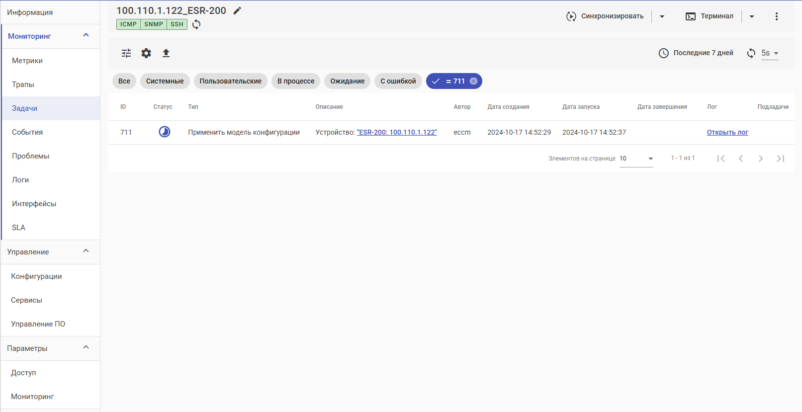 Для применения модели конфигурации нажмите кнопку "Сохранить и Применить" нижней панели управления и подтвердите сохранение настроек: будет создана задача на применение модели конфигурации. Статус выполнения задачи будет отображен во вкладке "Устройство" → "Мониторинг" → "Задачи":