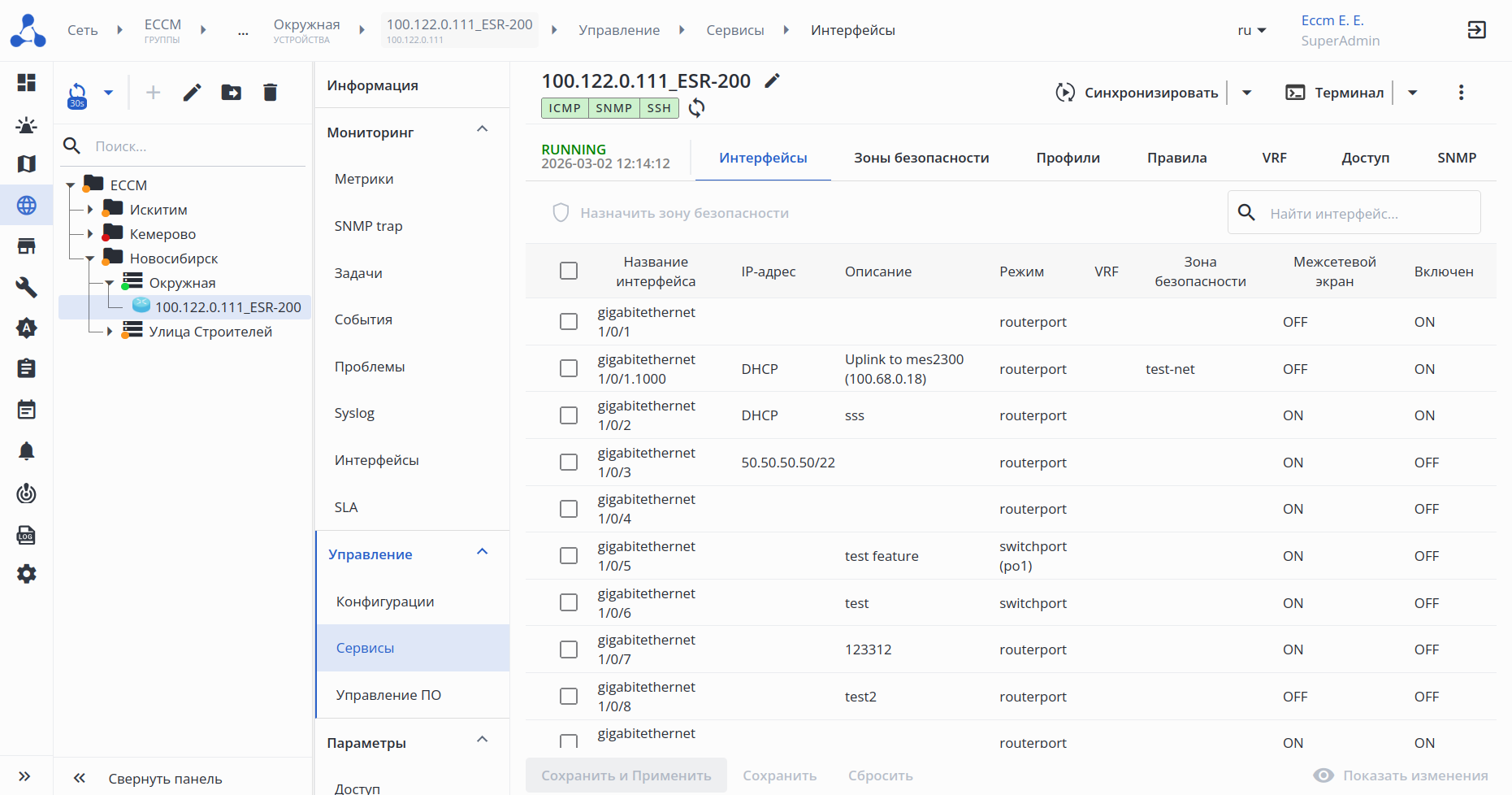 Для настройки интерфейсов устройства перейдите во вкладку "Устройство" → "Управление" → "Сервисы" → "Интерфейсы":
