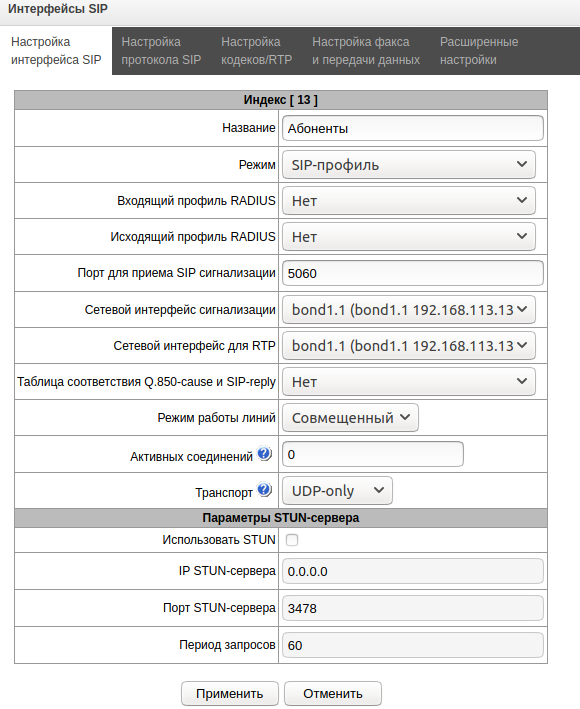 • Если используются отличные от стандартных (5060) порты сигнализации, то их нужно задать в полях "Порт назначения SIP сигнализации" и "Порт для приема SIP сигнализации";
