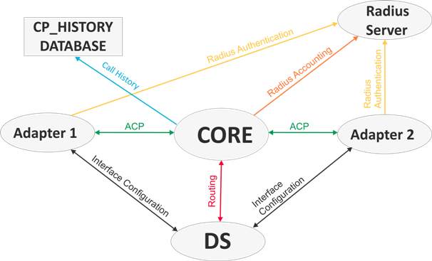 • Core — осуществляет управление вызовом, маршрутизацию телефонных вызовов и управление предоставлением услуг, собирает тарификационные данные об обслуженных вызовах и взаимодействует с посредником СОРМ;
