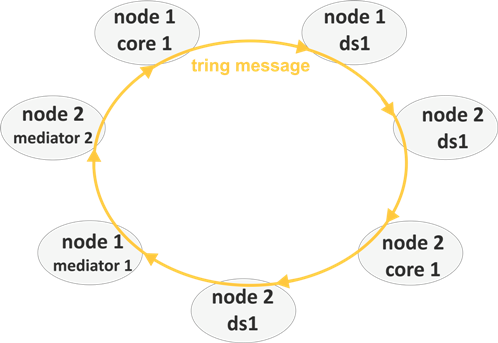 Режим разделения нагрузки при доставке сообщения клиенту используется для реализации в ECSS-10 резервирования «active-active». При такой схеме резерва все компоненты находятся в активном состоянии и обслуживают поступающую нагрузку в режиме разделения нагрузки. Конфигурационная информация и операционные данные системы синхронизируются между зарезервированными элементами. Если из строя выйдет какой-либо программный компонент, то за счет механизмов BUS вся поступившая на программный компонент нагрузка (все сообщения) будет считаться не обслуженной, и произойдет её повторная доставка на однотипный резервирующий программный компонент (другую ноду того же кластера), который осуществит обработку данной нагрузки. В случае выхода из строя аппаратной части (хоста) произойдет полное переключение обработки текущей и вновь поступающей нагрузки на оставшиеся в работе компоненты системы (ноды находящиеся на другом хосте). При восстановлении работоспособности вышедшего из строя компонента происходит его регистрация в системе и подписка на требуемые для его работы потоки информации (очереди), что приводит к началу поступления на него сообщений — компонент встает в работу.