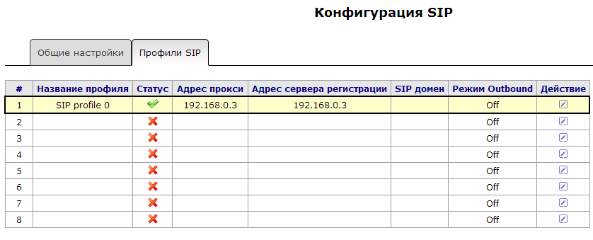 3. Для редактирования профиля в таблице «Профили SIP» («SIP profiles») в колонке «Действие» («Action») необходимо нажать на иконку редактирования профиля.