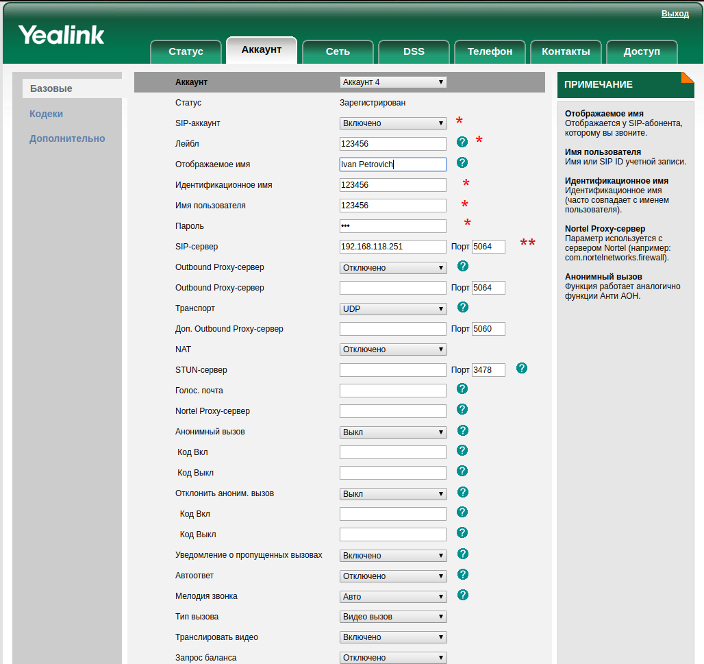 - SIP-аккаунт -флаг включает или выключает SIP-аккаунт;