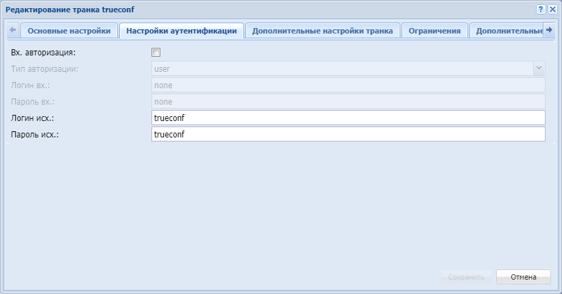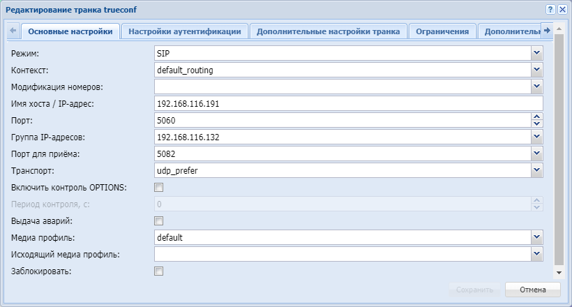 Дополнительное описание параметров интерфейсов (транков) приведено в Приложении Б. Набор параметров интерфейса SIP.