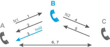 - Абонент В передает вызов (В отбивается — кладет трубку), между А и С устанавливается разговорное соединение;