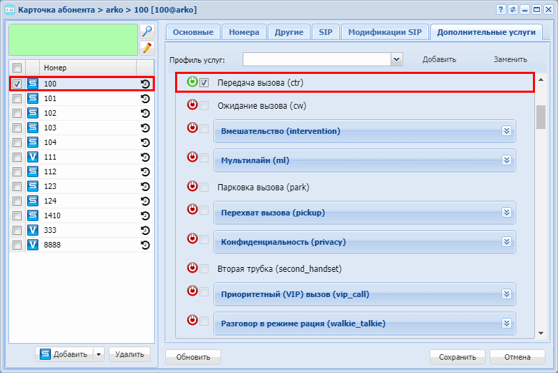- Разрешите использовать услугу абоненту — установите . Установите флаг напротив услуги "Передача вызова (ctr)".