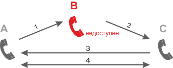 - Если абонент B недоступен, то происходит переадресация вызова на абонента С.