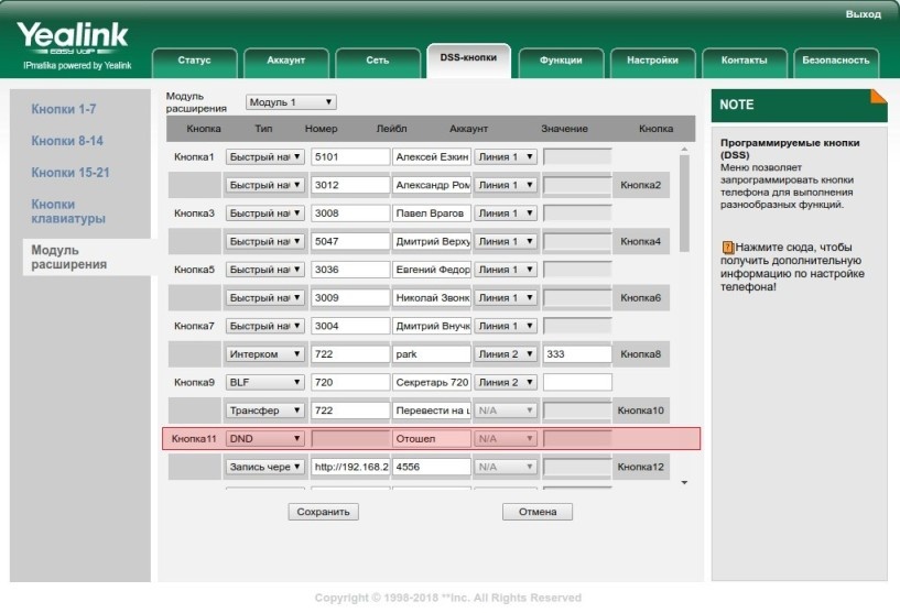 В web-конфигураторе ТА заходим в раздел DSS-кнопки->Кнопки 1-7 (при наличии модуля расширения можно выбрать его). На свободные кнопки настраиваем DND: Тип = DND; Лейбл = "Отошел"