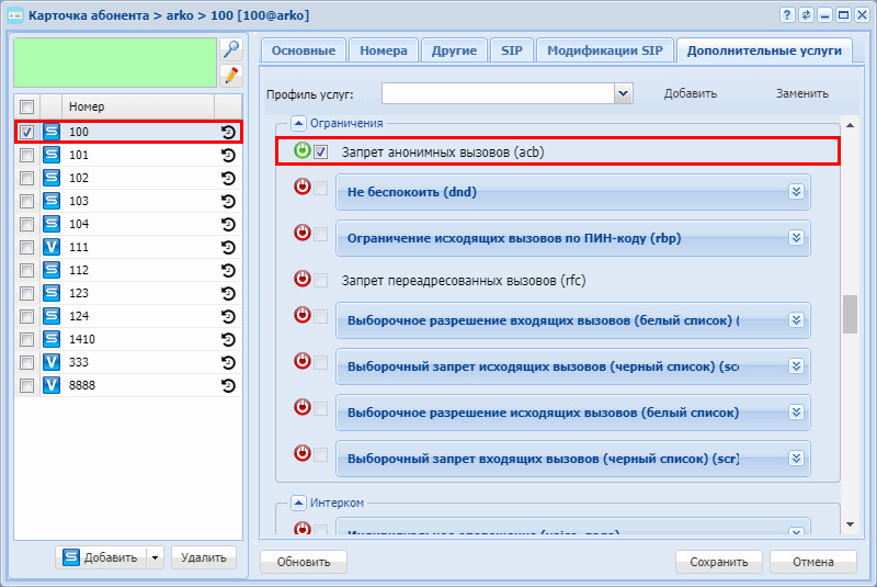 - Разрешите использовать услугу абоненту — установите . Установите флаг напротив услуги "Запрет анонимных вызовов (acb)".