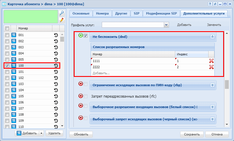 Активировать услугу "Не беспокоить (DND)" для абонента с номером 100 виртуальной АТС "arko" и разрешить абонентам с номерами "1111" с индексом "1", "2222" с индексом "2" совершать входящие вызовы на номер "100".