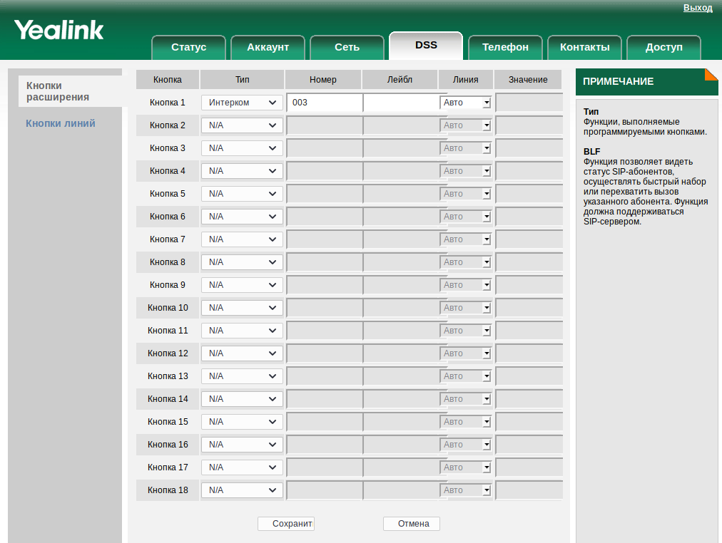 2. Выбрать для DSS кнопки Тип Интерком, задать Номер абонента на которого будет произведен вызов.