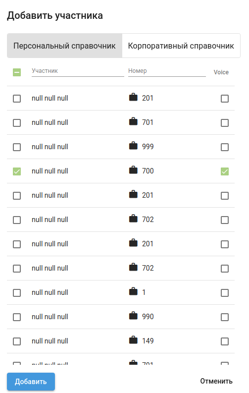 - Голос — наличие голоса у абонента при присоединении к селекторному совещанию;