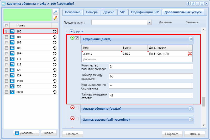 - Разрешите использовать услугу абоненту — установите . Установите флаг напротив услуги "Будильник (alarm)".