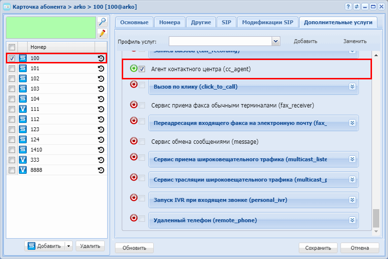 2. Разрешите использовать услугу абоненту — установите . Установите флаг напротив услуги "Агент Call-центра (cc_agent)" ("Contact-Center agent").