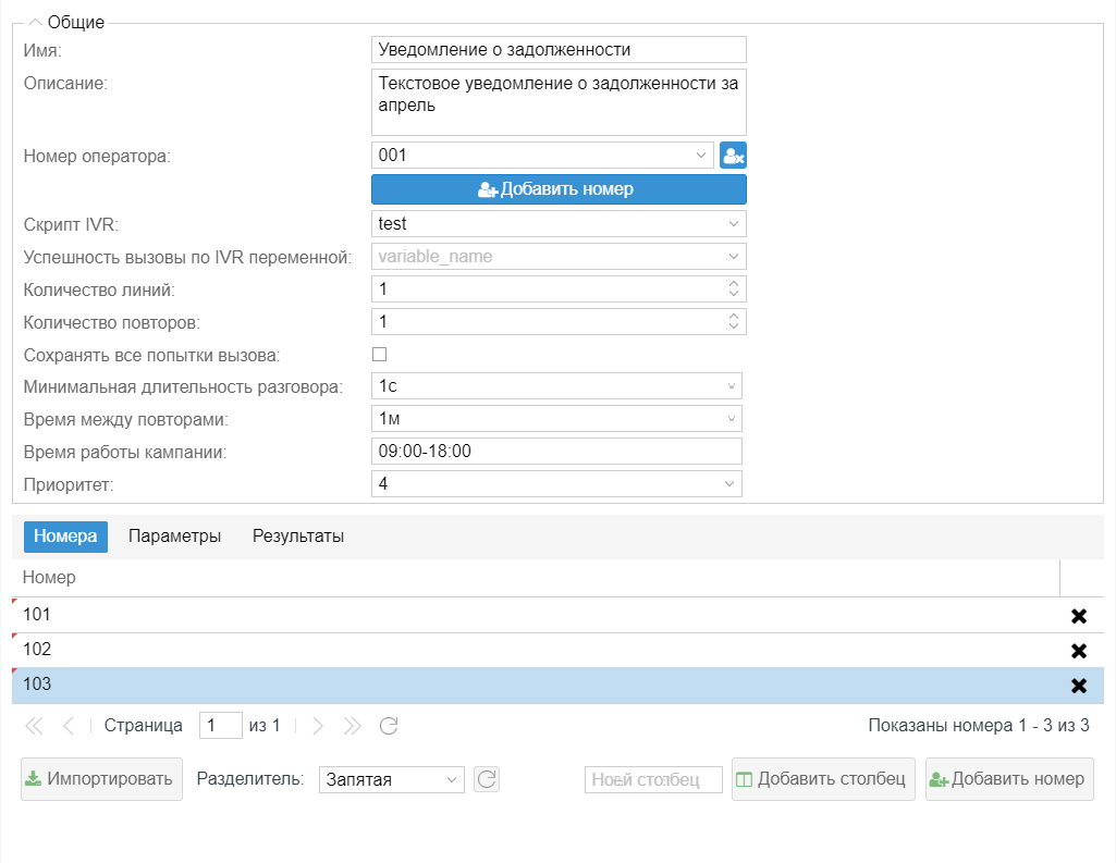 - Запустить кампанию обзвона, указав дополнительные параметры, если это необходимо.