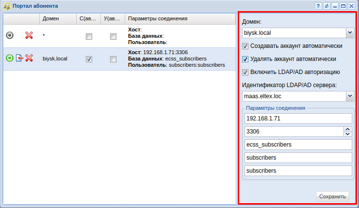 Настройка соединения с MySQL БД "Портала абонента" через web-конфигуратор