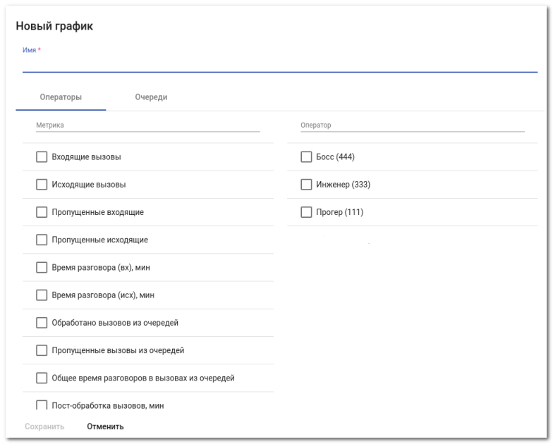 После этого появится окно в котором можно задать название графику, выбрать операторов или очереди, а также метрики на основе которых будет выстроена статистика.
