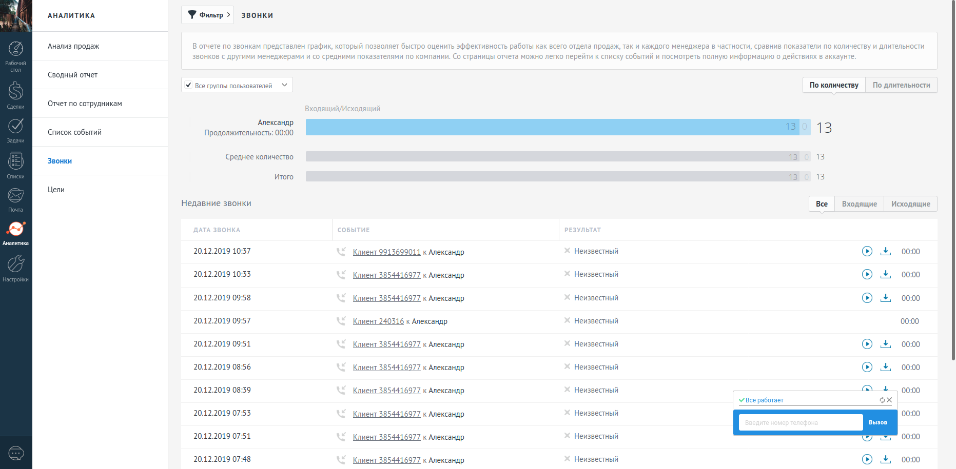 Таким образом, мы получаем возможность в интерфейсе amoCRM видеть историю вызовов: