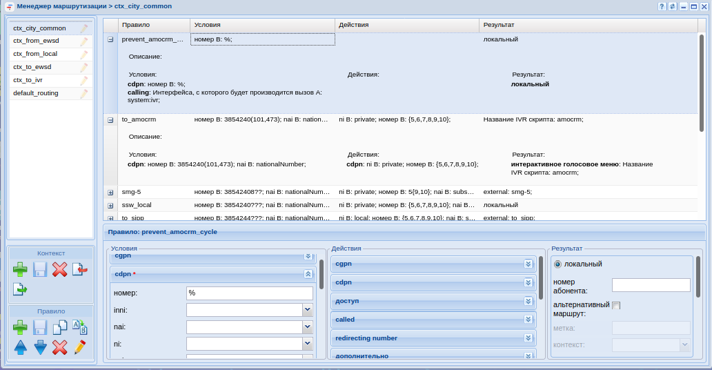 Как видно, в качестве номера, на который делается вызов используется CDPN. В чистом виде данный блок Dial приведёт к зацикливанию, так как вызов снова попадёт на тот же самый IVR сценарий. Чтобы этого не происходило, необходимо добавить ещё одно правило маршрутизации, в котором в условиях в разделе доступ указан интерфейс system:ivr. Маршрутизировать данное правило должно на локального абонента. Назовём это правило prevent_amocrm_cycle.