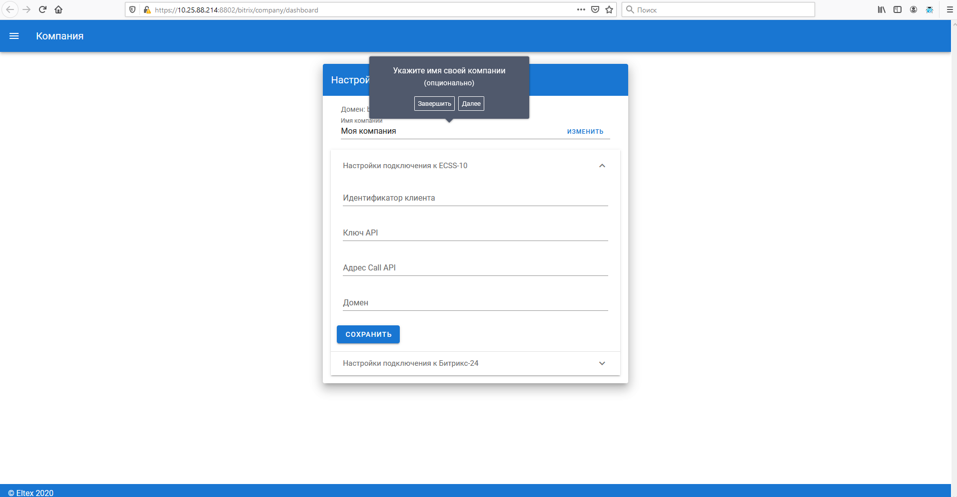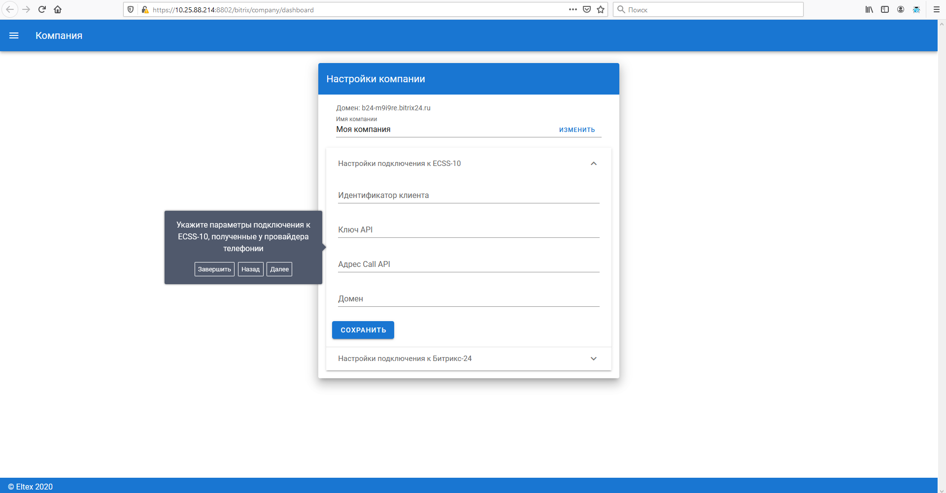 После настройки подключения к ECSS-10 перейдите на вкладку "Настройки подключения к Битрикс-24".