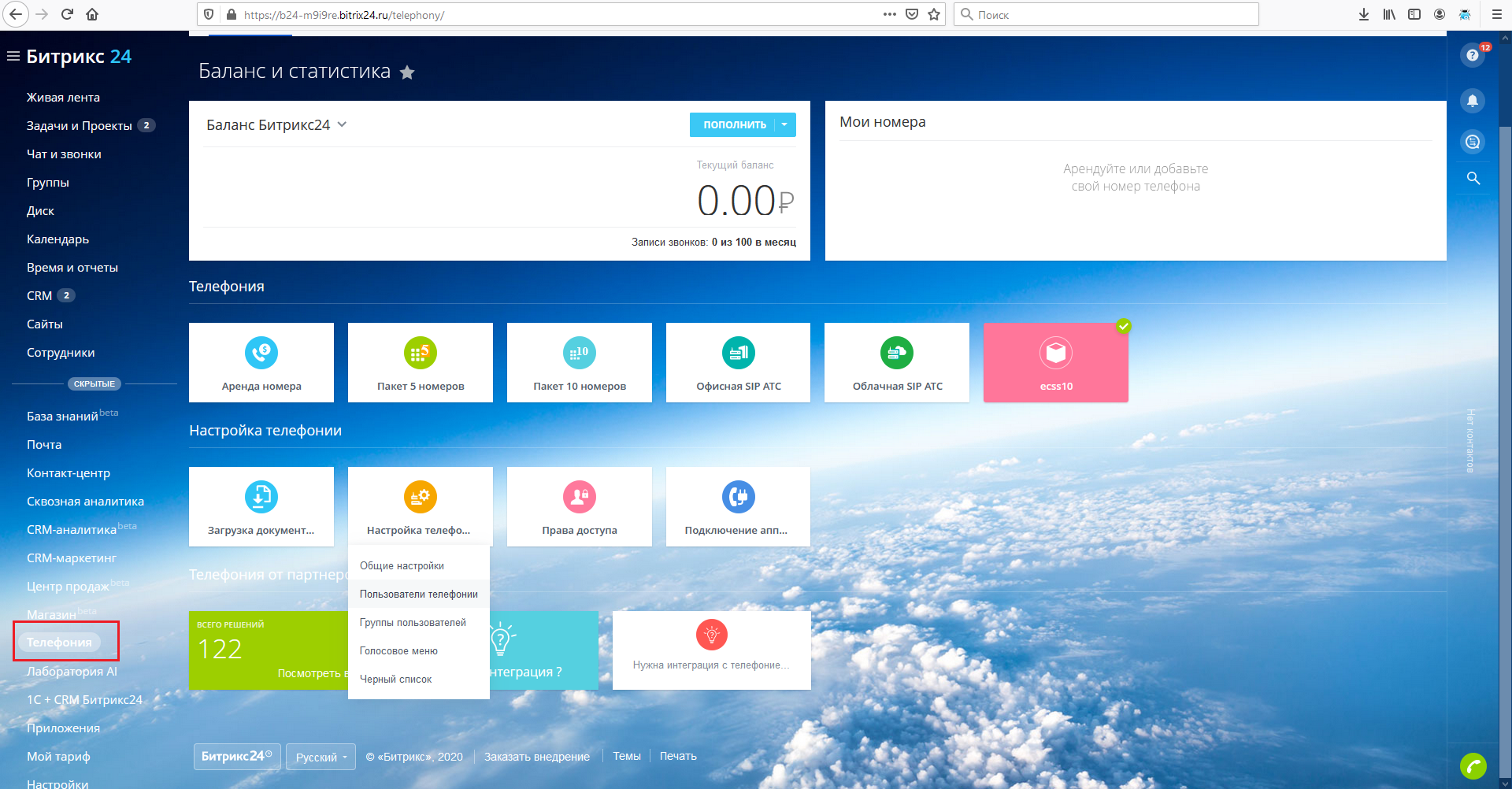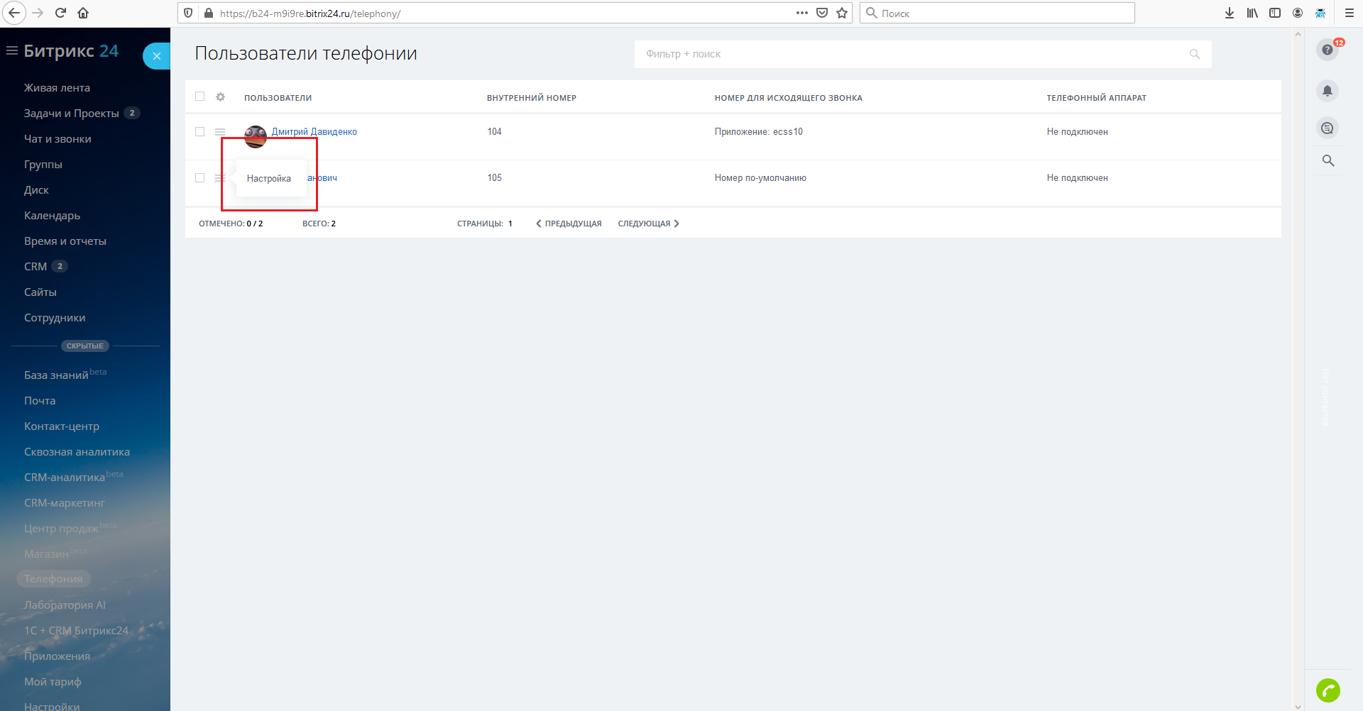 Для включения click 2 call необходимо в интерфейсе компании в Битрикс-24 перейти на страницу настроек телефонии.
