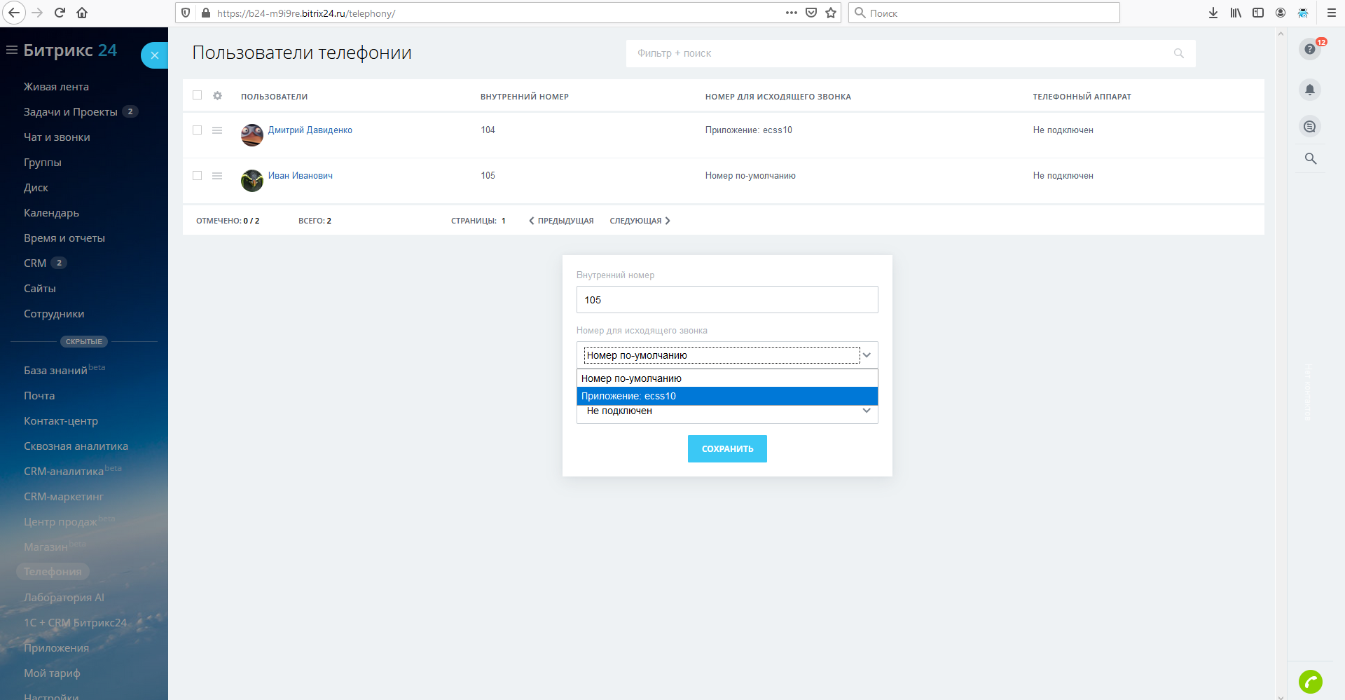 При регистрации компании в ecss-crm-server список пользователей выгружается из аккаунта Битрикс-24. ecss-crm-server использует номера, указанные в профиле пользователя как "внутренний номер".