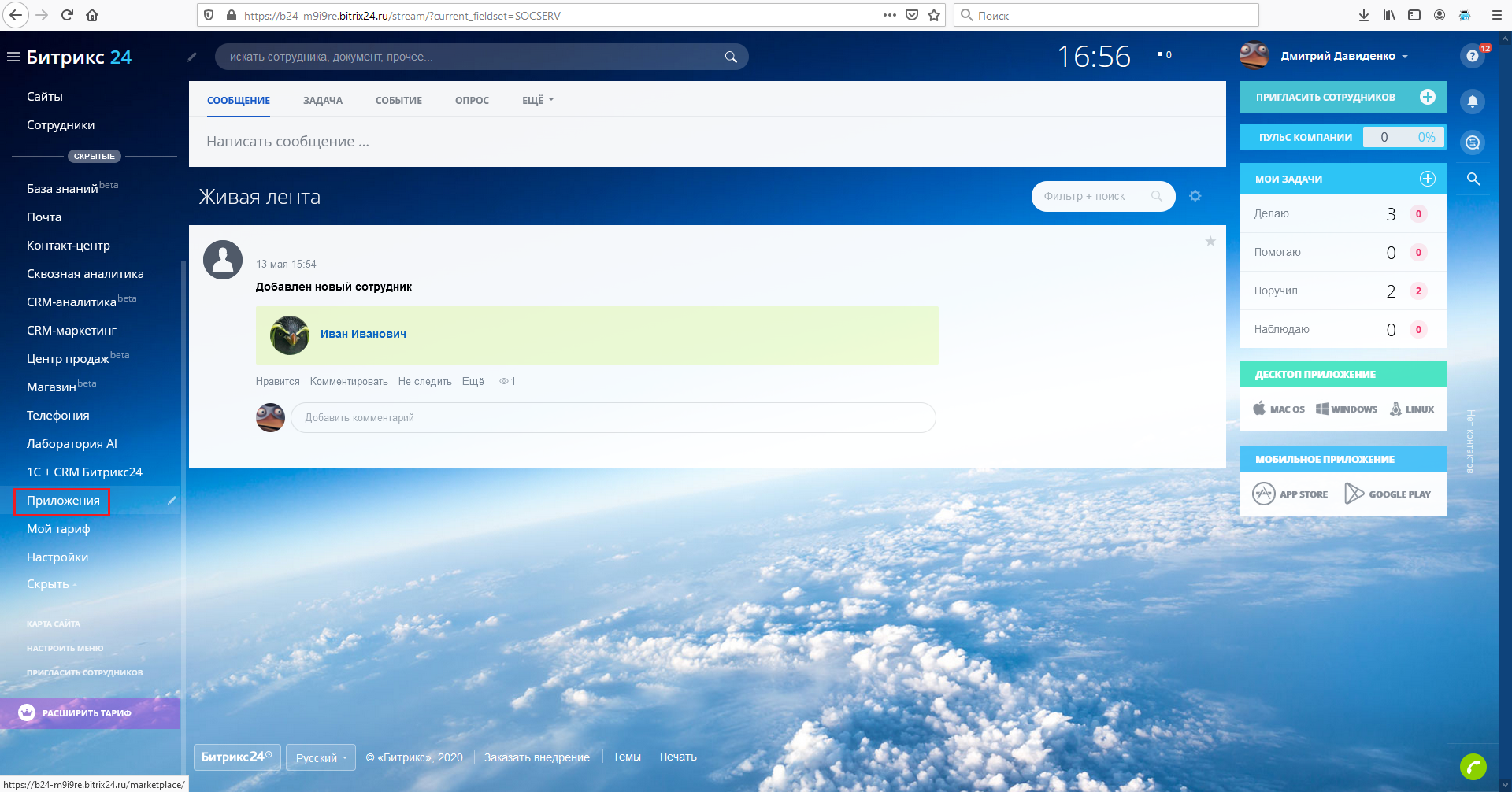 Нам необходимо создать локальное приложение Битрикс-24. Для перехода в меню приложений нужно нажать "Ещё" в меню Битрикс-24 в левой части экрана.