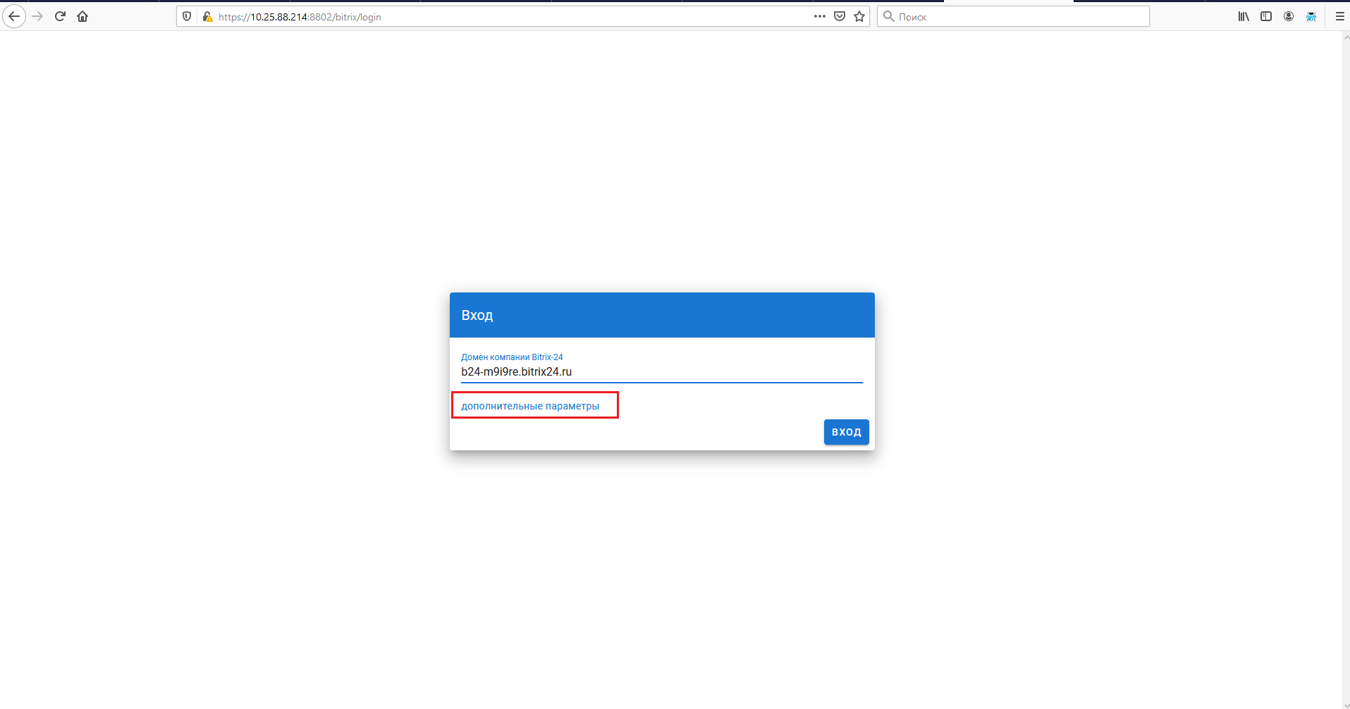 Так как это первый вход, нам нужно указать параметры "Код приложения (client id)", "Ключ приложения (client secret)" и "Домен компании". Для этого необходимо нажать на "дополнительные параметры".